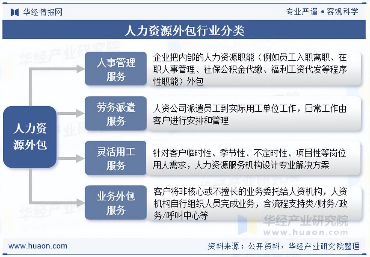 (来源:华经产业研究院) 一、人力资源外包行业基本概述 人力资源外包,简称HRO,人力资源外包作为外包服务的一种形式,是指企业根据自身资源情况,把原本由企业自己进行的一项或几项人力资源管理工作或职能,通过支付酬金的方式,交给第三方专业服务商去完成,从而达到降低成本、提高效率、增强企业核心竞争力的一种管理模式。常见的人力资源外包一般包括人事管理服务、劳务派遣服务、灵活用工服务和业务外包服务等。